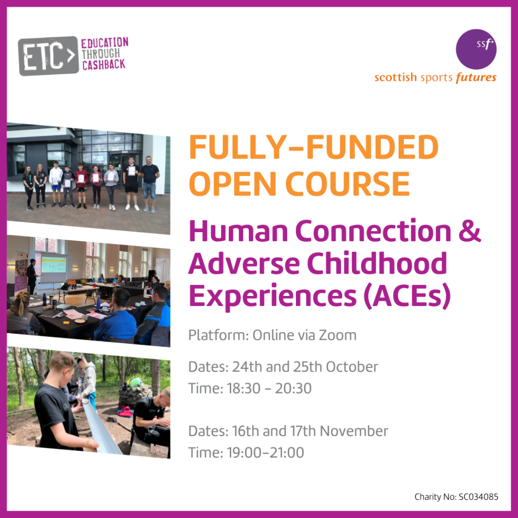 In September, the Education Through Cashback (ETC) team held an open ‘Human Connection and Adverse Childhood Experiences (ACEs)’ module delivery to upskill and increase the knowledge of practitioners who are working with young people in a sport and physical activity. The module focused on the importance of human connection and the relationship between ACEs and sport and physical activity.
